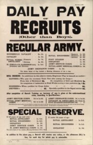 The British Army did not have a central record keeping system until the First World War. Prior to 1914, military records were kept by individual regiments. These records comprise soldiers’ attestation and discharge papers and form part of the War Office (WO) series of records now held at The National Archives in London, England. Useful websites for finding online copies of these records are Find My Past and Fold 3.