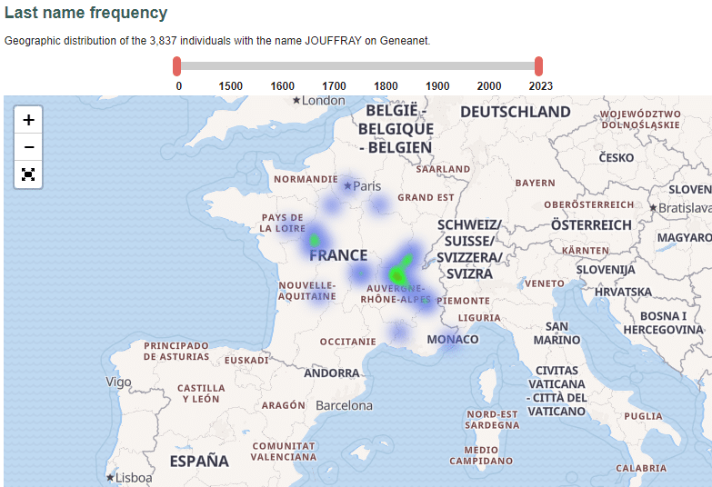 The distribution and locations are based on Geneanet community member trees. Just below the Last Name Frequency title at the top of the image we can read ‘Geographic distribution of the 3,837 individuals with the name JOUFFRAY on Geneanet.’