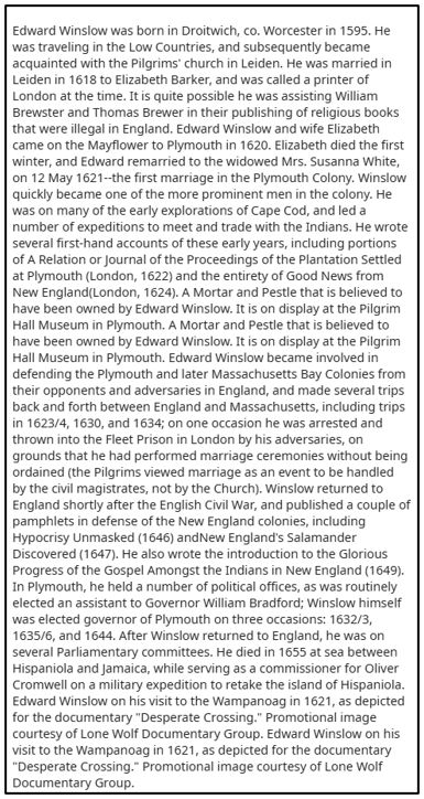 Photos, Stories, Documents, and Audio (if applicable) can then be viewed for Gov. Edward Window II (1595-1655). It is important to remember that FamilySearch’s Family Tree is similar to Wikipedia – the information is contributed by many different people. So, the amount of material available for each person is dependent on what has been contributed.
