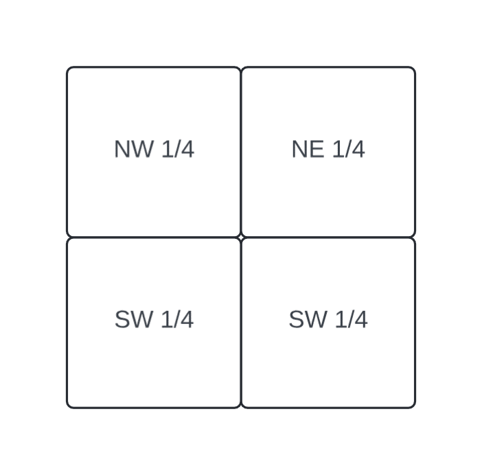 Each of these sections is further divided. One square mile is 640 acres. A homestead plot was 160 acres or one-quarter of a section. This survey system resulted in square and rectangular tracts of land with systematic legal descriptions, such as Township 3N Range 4W section 18 NW ¼. The chart below shows the quarter sections.