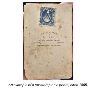 Personal property tax covered many different items that didn’t fall under land or houses. This kind of tax was imposed on various items, depending on the year and location. In 1782, Virginia implemented the personal property tax system to generate revenue. Beginning in 1815, luxury items such as musical instruments and furniture began being taxed to recover from the War of 1812. Enslaved persons are only recorded as numbers in the tax lists of their enslavers. Not until 1866 did men of color aged 21 and up appear by name in tax lists. During the Civil War, a tax on photographs was collected in the Union States from 1864 to 1866. The backs of photos taken during these years sometimes have a tax stamp, which is proof that the person paid the tax on the photograph.